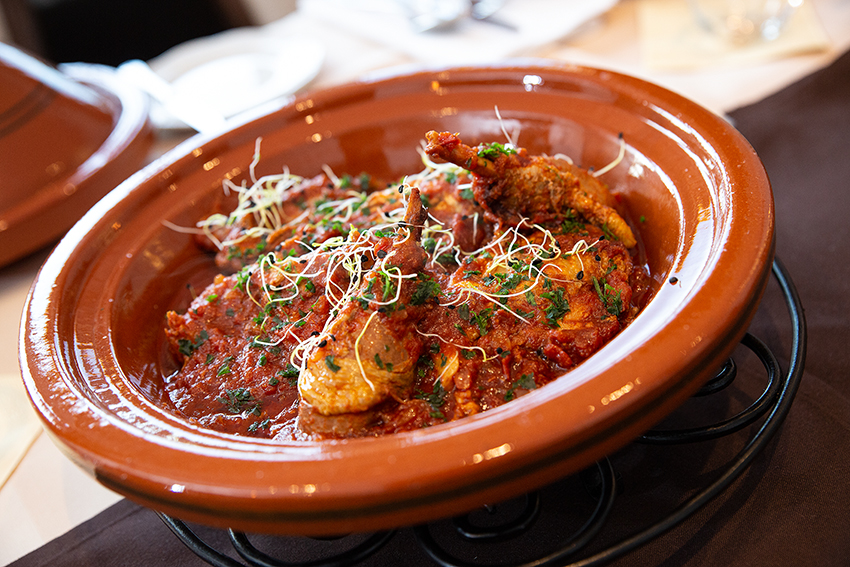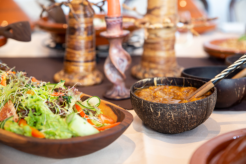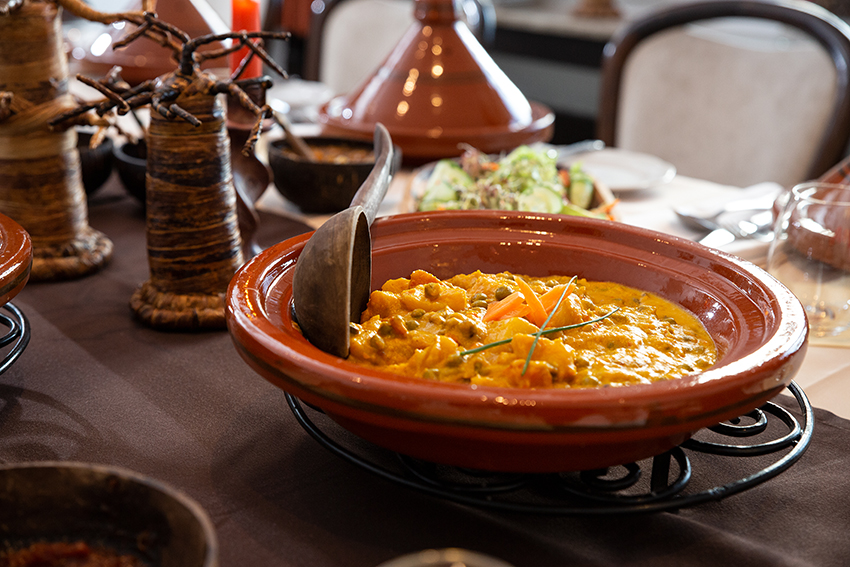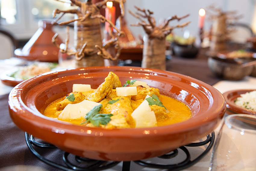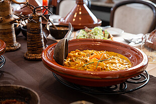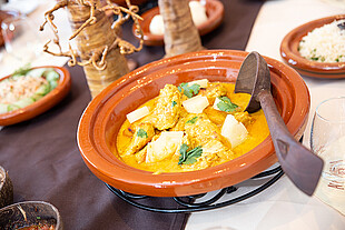 Dann folgt eine typische Suppe. Beim Öffnen der Tajine finden Sie im Inneren eine Kokosnussschale, in der wir Ihnen eine geschmacksintensive reduzierte Brühe von Freilandhühnern (oder vegane Alternative) mit grünen Kräutern servieren. Es ist Ihnen überlassen, ob Sie die Brühe löffeln oder diese direkt aus der Kokosnussschale trinken. Das wärmt Ihren Körper und bereitet Sie auf die aromatischen Currys & Masalas vor.